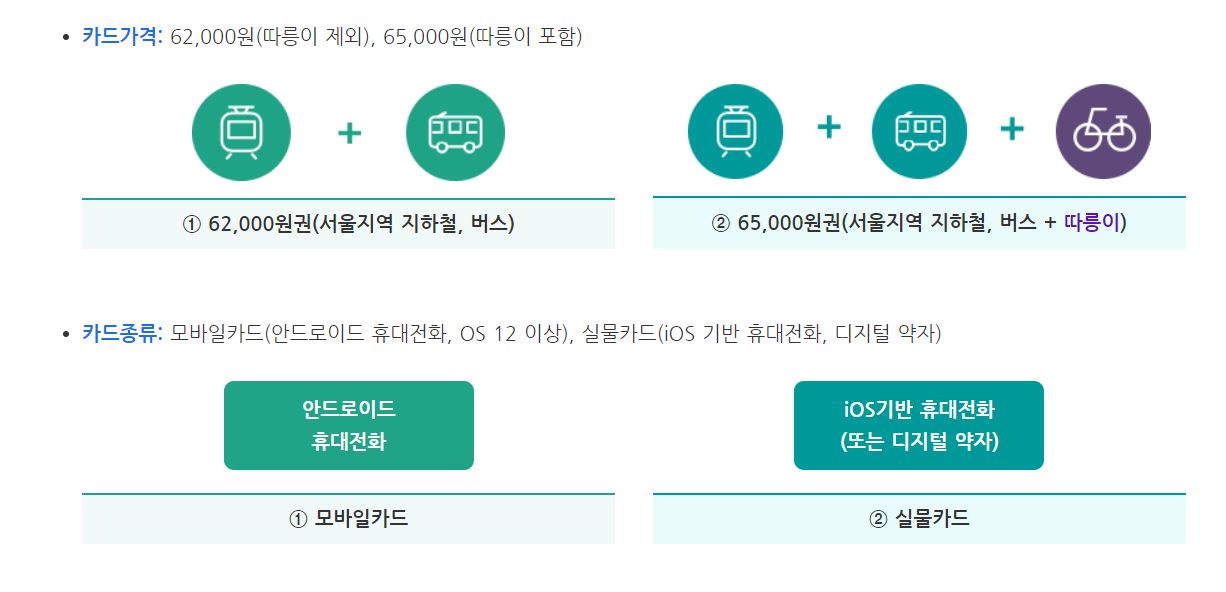 - 이용범위: 서울지역 지하철, 서울시 면허 시내·마을버스, 따릉이