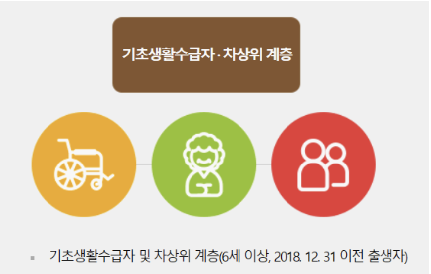 기초생활수급자 및 차상위계층(6세이상, 2018.12.31 이전 출생자)